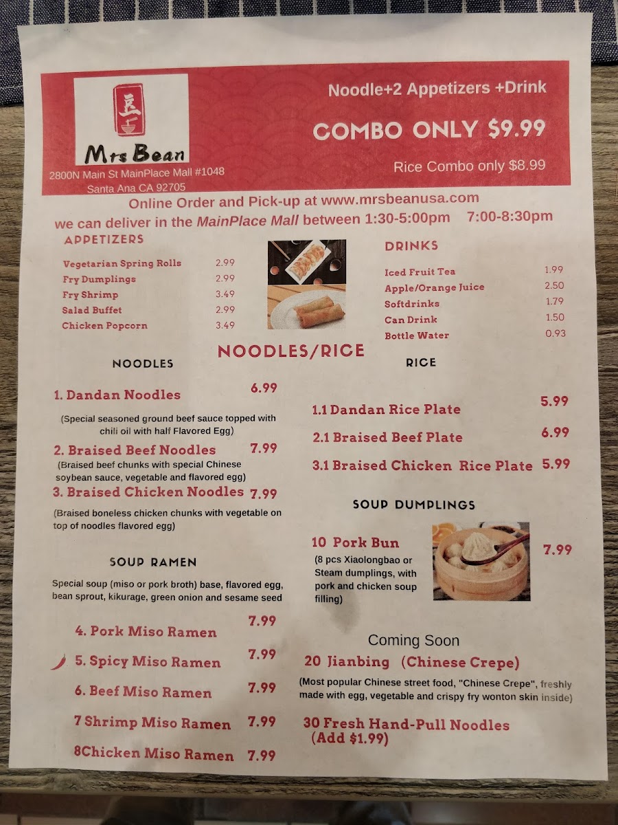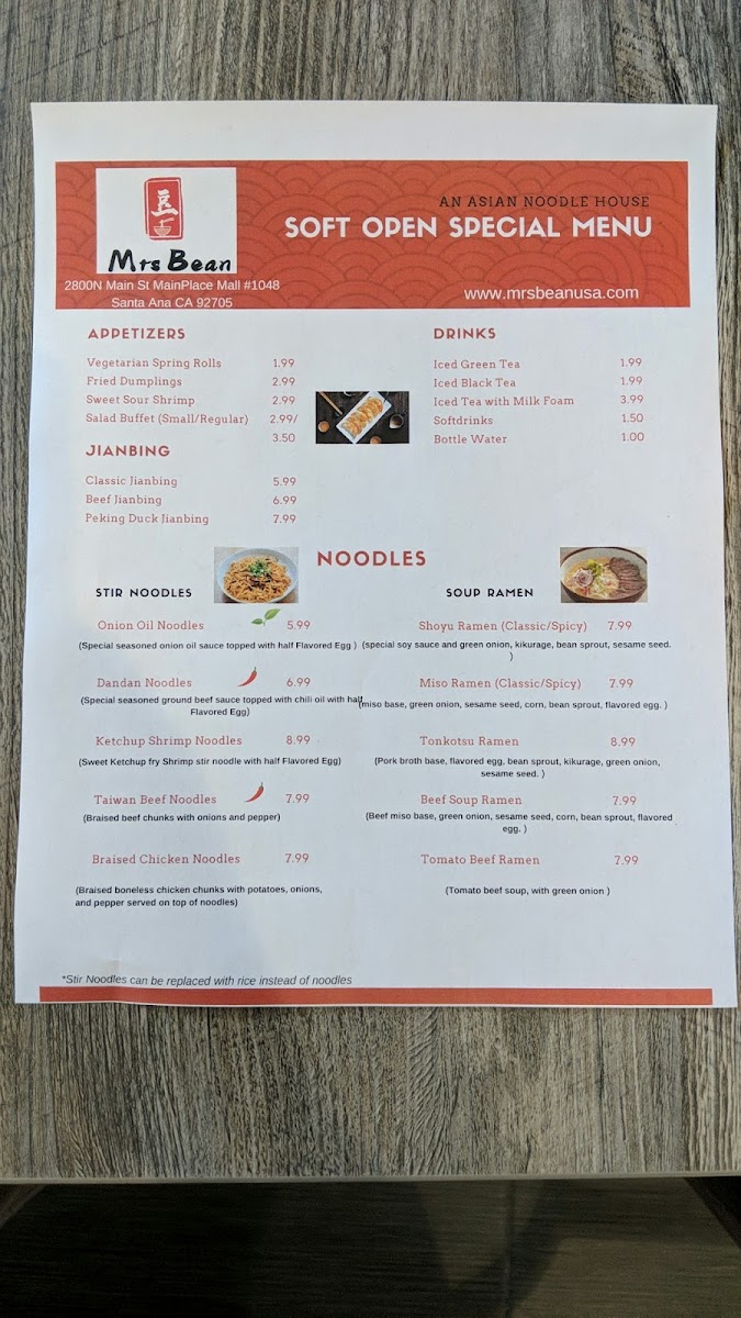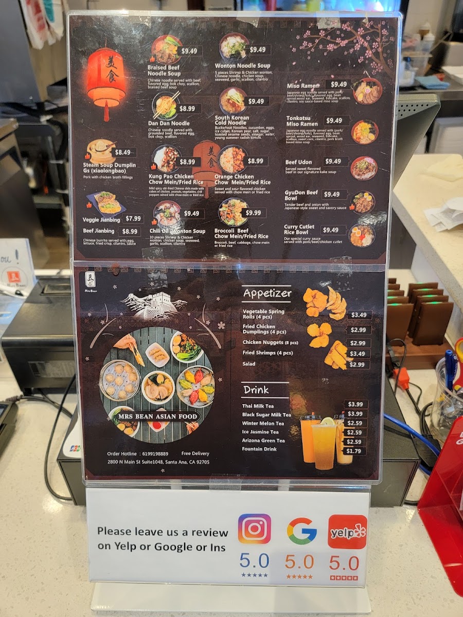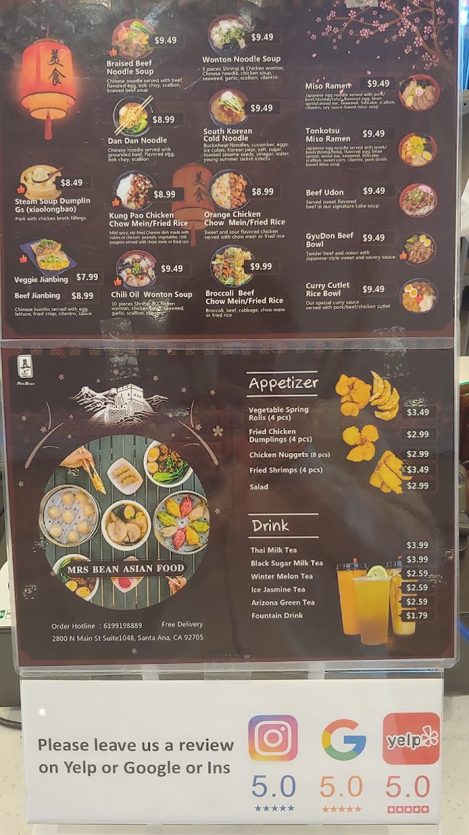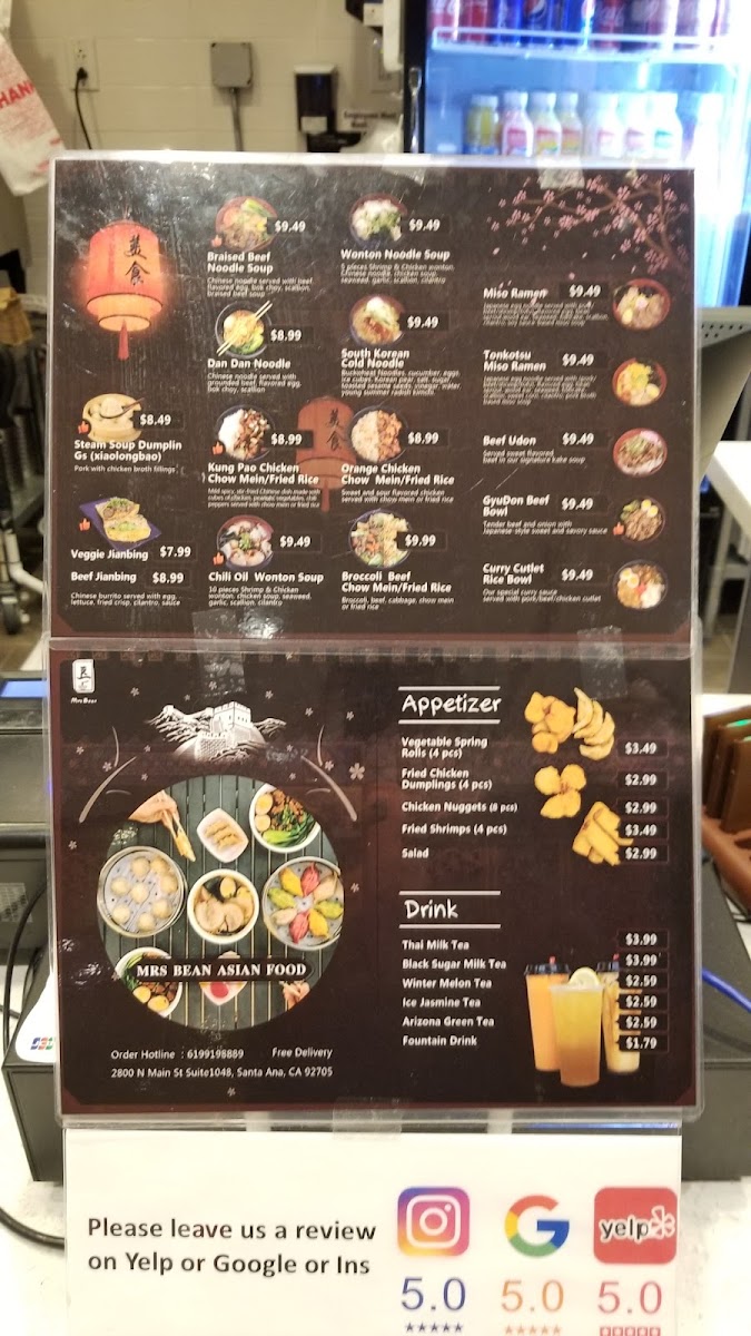 If you're craving a delicious and satisfying meal, look no further than Mrsbean Jianbing Menu. Nestled in the heart of Santa Ana, CA, this spot brings the authentic flavors of Chinese street food right to your plate. The jianbing, a popular Chinese savory pancake, is the star of the show here. Each bite is a perfect balance of crispy, savory, and flavorful, made fresh to order with a variety of fillings to choose from. Whether you’re in the mood for something classic or want to try a more adventurous twist, there’s something for everyone. The menu also includes a variety of tasty sides and beverages to complement your meal. It’s the ideal spot for anyone looking to enjoy bold flavors and a warm, welcoming atmosphere.